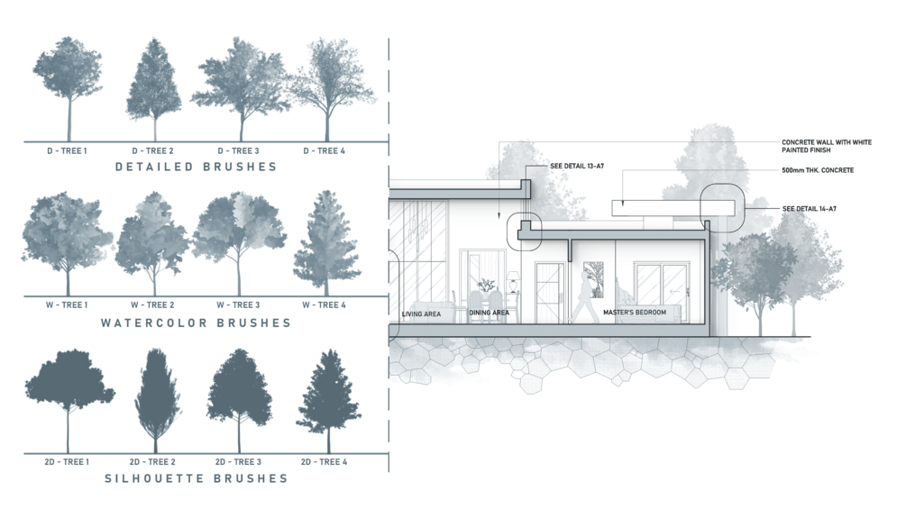 The product is a free version of the Architectural Tree Brush Set designed for rendering your elevations, sections, and architectural illustrations.