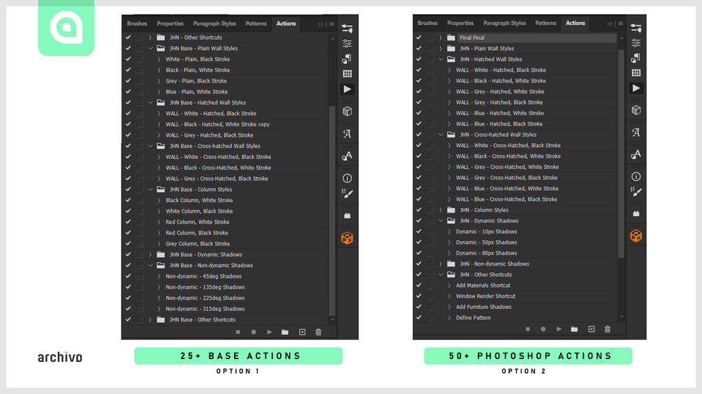 This Photoshop Toolkit consists of a lot of features designed to speed up your floor plan rendering process. It uses Adobe Photoshop’s Actions to automate the process with only ONE CLICK!