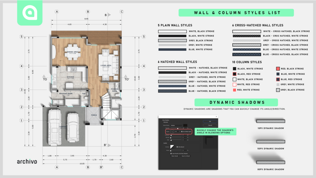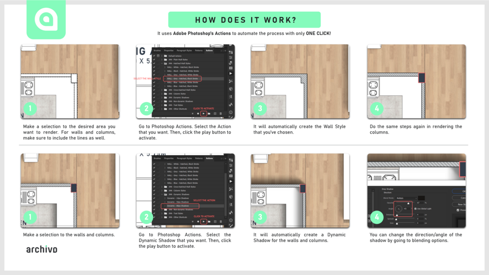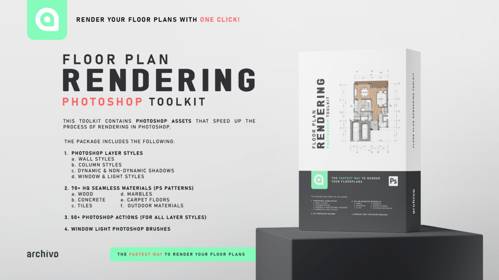 This Photoshop Toolkit consists of a lot of features designed to speed up your floor plan rendering process. It uses Adobe Photoshop’s Actions to automate the process with only ONE CLICK!
